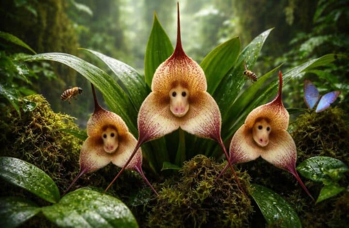 La morphologie de l’orchidée tête-de-singe est remarquable. Les parties florales montrent une configuration qui semble imiter les expressions d’un singe, une adaptation évolutive qui pourrait avoir évolué pour attirer des pollinisateurs spécifiques. De plus, ses fleurs dégagent un parfum subtil, souvent comparé à celui des oranges mûres, ajoutant une autre dimension à son attrait.