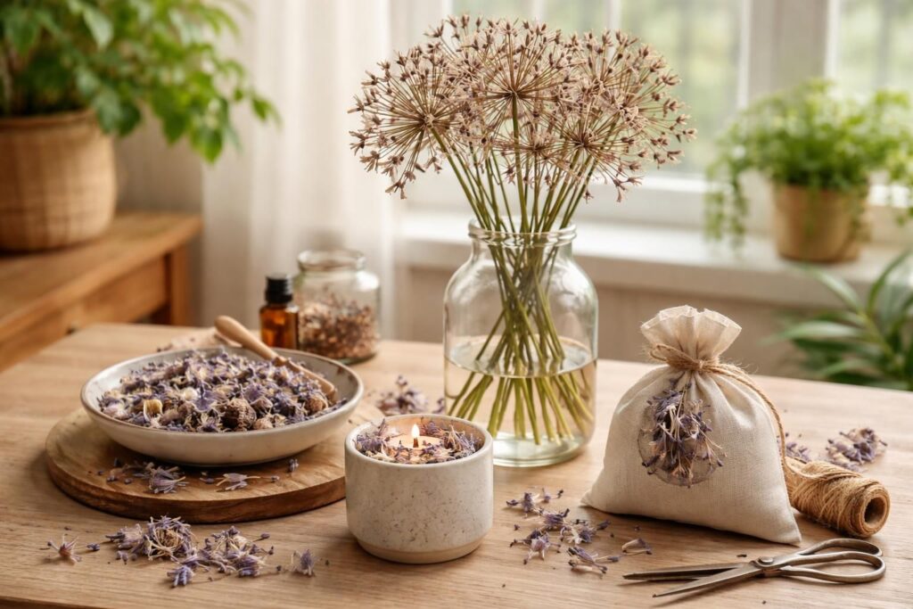 - Créer des couronnes florales en intégrant des fleurs fanées avec des plantes séchées.